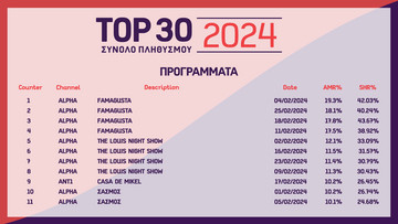 Οι σειρές του Alpha γίνονται… “talk of the town”, η ψυχαχωγία φέρνει γέλιο και διασκέδαση στον τηλεθεατή ενώ η ενημέρωση κερδίζει το στοίχημα της εγκυρότητας. Famagusta, Λούης Νight Show και Σασμός σαρώνουν τον πίνακα τηλεθέασης και δείχνουν την παντοδυναμία τους στο τηλεκοντρόλ του τηλεθεατή