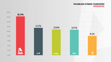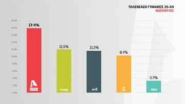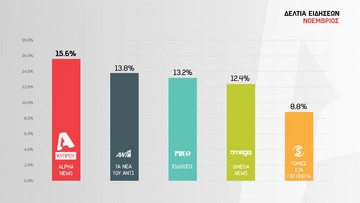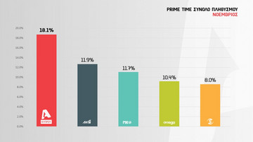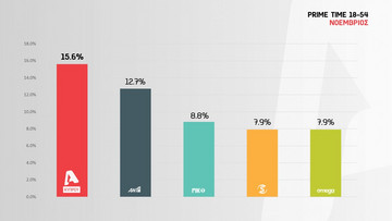Αναλυτικά, τα μηχανάκια έπαθαν Alpha – Alpha πανικό τον Νοέμβριο. Το σύνολο του πληθυσμού προτίμησε Alpha με αποτέλεσμα να είναι πρώτος με 16.3%, αφήνοντας το δεύτερο κανάλι πίσω με ποσοστό 11,5%, δείχνοντας την άνετη πρωτιά του, με σχεδόν 5% διαφορά.