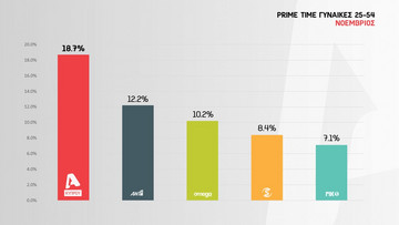 Στην prime time ζώνη τα νούμερα τηλεθέασης είναι ακόμη πιο εντυπωσιακά, φθάνοντας το 18.1% με πάνω από 6% διαφορά από τον δεύτερο.