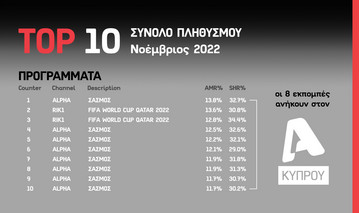Η επιτυχία της prime time ζώνης και της μυθοπλασίας διαφαίνεται και στα κορυφαία προγράμματα του μήνα. Για τον μήνα Νοέμβριο, το top 10 της κυπριακής τηλεόρασης κατακτήθηκε από τον Alpha Κύπρου, αφού τα 8 πιο επιτυχημένα προγράμματα ανήκουν στο κανάλι (συμπεριλαμβανομένου και της κορυφής). Ο «Σασμός» συνεχίζει και καθηλώνει το κοινό με τις καταιγιστικές του εξελίξεις και δεν άφησε ούτε το Μουντιάλ να του πάρει το “τρόπαιο” της… προτίμησης.