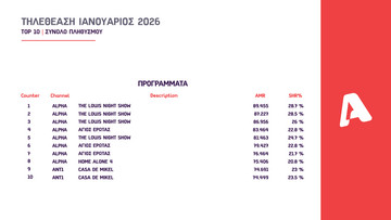 Nέος χρόνος με τον πρώτο μήνα να κλείνει… Alpha – Alpha, με σαρωτικά νούμερα τηλεθέασης για το κανάλι του Alpha Κύπρου, το οποίο ήταν η πρώτη επιλογή με μεγάλη διαφορά σε γενικό σύνολο αλλά και νεανικό κοινό.