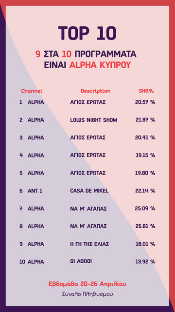 Η επιτυχία της prime time ζώνης και της μυθοπλασίας διαφαίνεται και στα κορυφαία προγράμματα της εβδομάδας. Για την προηγούμενη εβδομάδα, το top 10 της κυπριακής τηλεόρασης κατακτήθηκε από τον Alpha Κύπρου, αφού και τα 9 πιο επιτυχημένα προγράμματα ανήκουν στο κανάλι.
