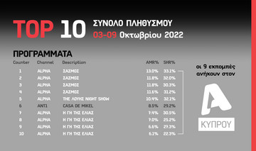 Η επιτυχία της prime time ζώνης και της μυθοπλασίας διαφαίνεται και στα κορυφαία προγράμματα της εβδομάδας. Για την προηγούμενη εβδομάδα το top 10 της κυπριακής τηλεόρασης κατακτήθηκε από τον Alpha, αφού 9 στα 10 πιο επιτυχημένα προγράμματα ανήκουν στο κανάλι. “Λούης Night Show” , “Η γη της Ελιάς” και “Σασμός” , σπάνε κάθε ρεκόρ τηλεθέασης με τον κόσμο να αδημονεί για σάτιρα αλλά και δράση.