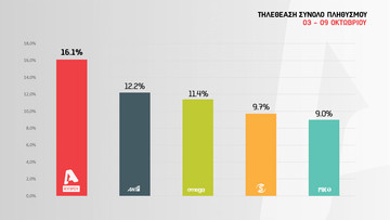 Ο Alpha είναι πρώτος με 16.1%, αφήνοντας το δεύτερο κανάλι πίσω με ποσοστό 12,2%, δείχνοντας την άνετη πρωτιά του, με σχεδόν 4% διαφορά.