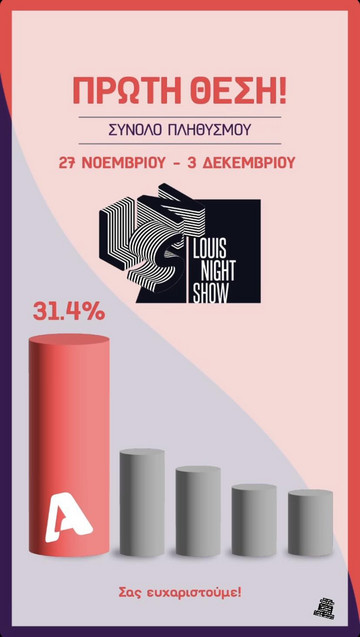 Το Λούης Night Show σημείωσε το ποσοστό 31,4%, δείχνοντας για άλλη μια φορά την προτίμηση των Κυπρίων στον Λούη Πατσαλίδη και την εκπομπή του ALPHA Κύπρου.