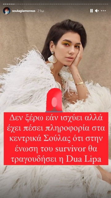 Συγκεκριμένα ανέφερε πως έχει μια πληροφορία ότι στο πάρτι της ένωσης θα τραγουδήσει η Dua Lipa, μία από τις πιο πετυχημένες και δημοφιλής τραγουδίστριες αυτή τη στιγμή παγκοσμίως. Αναμένουμε, λοιπόν, να δούμε τι τελικά θα γίνει στην ένωση των δύο ομάδων στο Survivor!
