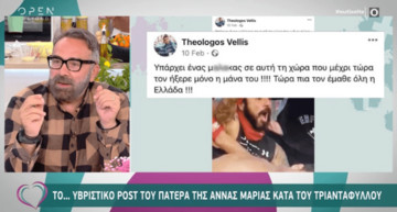 Χθες το πρωί, μέσα από την εκπομπή «Ευτυχείτε», παρουσιάστηκε ένα σχόλιο που έκανε ο πατέρας της Άννας Μαρίας Βέλλη στον προσωπικό του λογαριασμό στο Facebook. Το σχόλιο δεν προοριζόταν για την απόδοση της κόρης του, αλλά για τον… Τριαντάφυλλο. Συγκεκριμένα ο Θεολόγος Βέλλης σχολίασε τον Τριαντάφυλλο ενώ στην ανάρτηση περιείχε και υβριστικά σχόλια. Αν και η ανάρτηση είχε σβηστεί μετά από λίγο, ήδη είχε κάνει το γύρω του διαδικτύου.
