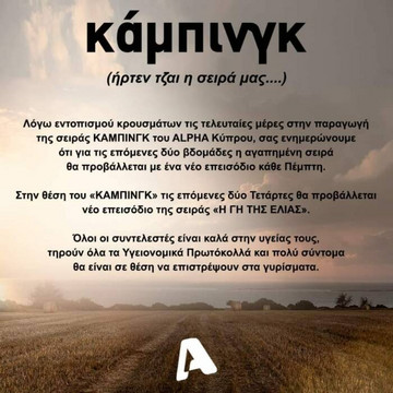 ΗΡΤΕΝ ΤΖΑΙ Η ΣΕΙΡΑ ΜΑΣ…λόγω εντοπισμού κρουσμάτων τις τελευταίες μέρες στην παραγωγή της σειράς ΚΑΜΠΙΝΓΚ του ALPHA Κύπρου, σας ενημερώνουμε ότι για τις επόμενες δύο βδομάδες η αγαπημένη σειρά θα προβάλλεται με ένα νέο επεισόδιο κάθε Πέμπτη.Στην θέση του ΚΑΜΠΙΝΓΚ τις επόμενες δύο Τετάρτες θα προβάλλεται νέο επεισόδιο της σειράς «Η ΓΗ ΤΗΣ ΕΛΙΑΣ».Όλοι οι συντελεστές είναι καλά στην υγείας τους, τηρούν όλα τα Υγειονομικά Πρωτόκολλά και πολύ σύντομα θα είναι σε θέση να επιστρέψουν στα γυρίσματα.