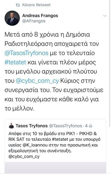 Ένας πολύ σημαντικός και δημιουργικός «κύκλος» έκλεισε για μένα , με το τέλος της αποψινής εκπομπής !!! Μετά από 8 τηλεοπτικές σεζόν με περίπου 240 καλεσμένους , σπουδαίες προσωπικότητες που είχαν κάτι σημαντικό να πουν , νιώθω «πλούσιος» που γνώρισα , συνομίλησα και αντάλλαξα απόψεις με αυτούς τους ανθρώπους . Νιώθω επίσης περήφανος που μετέφερα τις απόψεις , τις γνώσεις , την εμπειρία και την αλήθεια αυτών των προσωπικοτήτων στους Κύπριους τηλεθεατές μέσα από την δημόσια ραδιοτηλεόραση. Το ΤΕΤ-Α-ΤΕΤ ήταν ένα μεγάλο σχολείο . Θερμές ευχαριστίες σε όλες τις διευθύνσεις και διοικήσεις του ΡΙΚ από το 2012 μέχρι σήμερα για την εμπιστοσύνη που μου έδειξαν. Μπορείτε να παρακολουθήσετε τις φετινές εκπομπές του #tetatet στο κανάλι του YouTube TET-A-TET ME TON TASO TRYFONOS STO RIK . Κάνετε ΕΓΓΡΑΦΗ εκεί. Ένα μεγάλο ευχαριστώ στο χορηγό της εκπομπής , την RCB BANK και το @xenostravel για την πολύτιμη βοήθεια του. Το ΜΕΓΑΛΥΤΕΡΟ όμως «ευχαριστώ» το οφείλω στους τηλεθεατές που για 8 χρόνια τίμησαν με την προτίμηση τους και δυο τηλεοπτικά βραβεία το ΤΕΤ-Α-ΤΕΤ. Τα λέμε από Σεπτέμβριο , στο καινούργιο μας τηλεοπτικό «σπίτι» , τον Alpha Κύπρου.