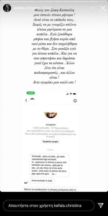 Από την πλευρά της η Χριστίνα Κεφαλάαπάντησε δημόσια ποστάροντας το μήνυμα στα Instastories της: «Φίλος του Σάκη Κατσούλη μου έστειλε τέτοιο μήνυμα! Αυτό είναι το επίπεδο τους. Χωρίς να με γνωρίζει στέλνει τέτοια μηνύματα σε μια κοπέλα. Εγώ ξεκάθαρα μπήκα και βγήκα κυρία από εκεί μέσα και δεν ασχολήθηκα με το θέμα. Σου μοιάζω εγώ για τέτοια κοπέλα; Και για να σου απαντήσω και δημόσια γιατί έχω και κότσια. Άλλοι λένε ότι είναι ποδοσφαιριστές και άλλοι είναι! Άντε αγοράκι μου καλό εσύ».
