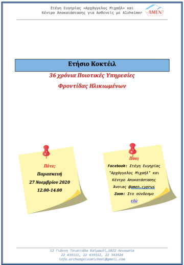Το Διοικητικό Συμβούλιο, η Διεύθυνση και το Προσωπικό σας προσκαλούν στην Ετήσια Εκδήλωση “Κοκτέιλ” για να εορτάσουμε διαφορετικά τα 36 χρόνια Κοινωνικής Προσφοράς στα άτομα της Τρίτης Ηλικίας.
