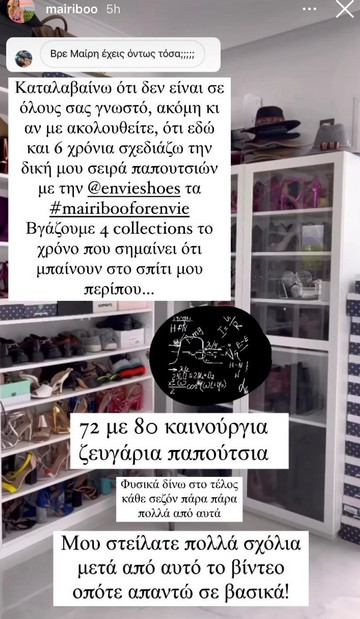 Επειδή εντύπωση προκάλεσε τα πολλά παπούτσια που έχει η ίδια διευκρίνισε η ίδια, έχει τόσα πολλά παπούτσια γιατί σχεδιάζει και δημιουργεί παπούτσια για την ελληνική εταιρία Envie shoes όποτε λαμβάνει 72-80 ζευγάρια παπούτσια το χρόνο δωρεάν.