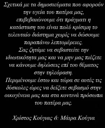 Λίγο νωρίτερα ο γιος του, Χρήστος Κούγιας, έκανε μία ανάρτηση ενημερώνοντας για το πόσο κρίσιμη είναι η κατάσταση της υγεία του μετά από δημοσιεύματα που υπήρξαν: