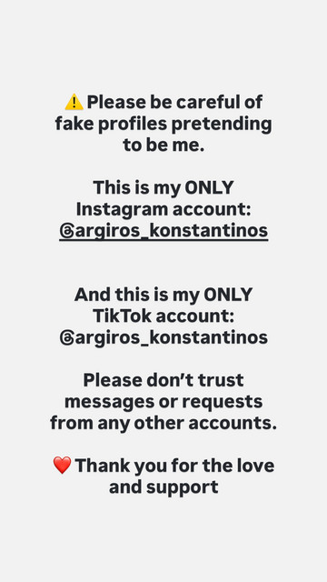 «Προσοχή!!! Κυκλοφορούν πολλά ψεύτικα προφίλ που προσποιούνται ότι είμαι εγώ. Μην εμπιστεύεστε άλλα προφίλ!!! Αυτός είναι ο μοναδικός λογαριασμός μου στο Instagram και αυτός είναι ο μοναδικός επίσημος λογαριασμός μου στο TikTok. Μην εμπιστεύεστε μηνύματα από άλλους λογαριασμούς. Σας ευχαριστώ για τη στήριξη», έγραψε χαρακτηριστικά.
