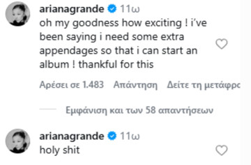 Ο λογαριασμός των θαυμαστών της σχολίασε: «Ποιος είναι υπεύθυνος που έδωσε στην Αριάνα έξι δάχτυλα», με την Γκράντε να απαντά στα σχόλια: «Σκ@τ@». Σε άλλο σχόλιό της πρόσθεσε χιουμοριστικά: «Παναγία μου, πόσο συναρπαστικό. Έλεγα ότι χρειάζομαι μερικά επιπλέον άκρα για να μπορέσω να ξεκινήσω ένα άλμπουμ. Ευγνώμων γι’ αυτό».