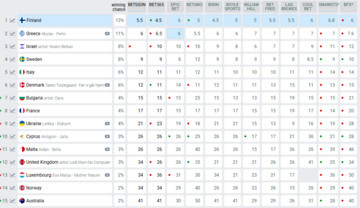 Στον συγκεντρωτικό πίνακα των στοιχηματικών εταιρειών, η Ελλάδα προσπέρασε το Ισραήλ, το οποίο παραμένει ψηλά παρά το γεγονός ότι δεν έχει κυκλοφορήσει ακόμη το τραγούδι του.