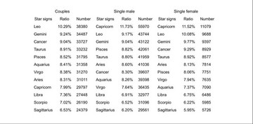 Τα αποτελέσματα δείχνουν πως άντρες και γυναίκες ταυτίζονται αναφορικά με τη συγκεκριμένη προτίμηση: έτσι, με σειρά προτεραιότητας, οι Αιγόκεροι, οι Λέοντες και τέλος οι Δίδυμοι είναι εκείνοι που βρίσκονται στην κορυφή της λίστας.